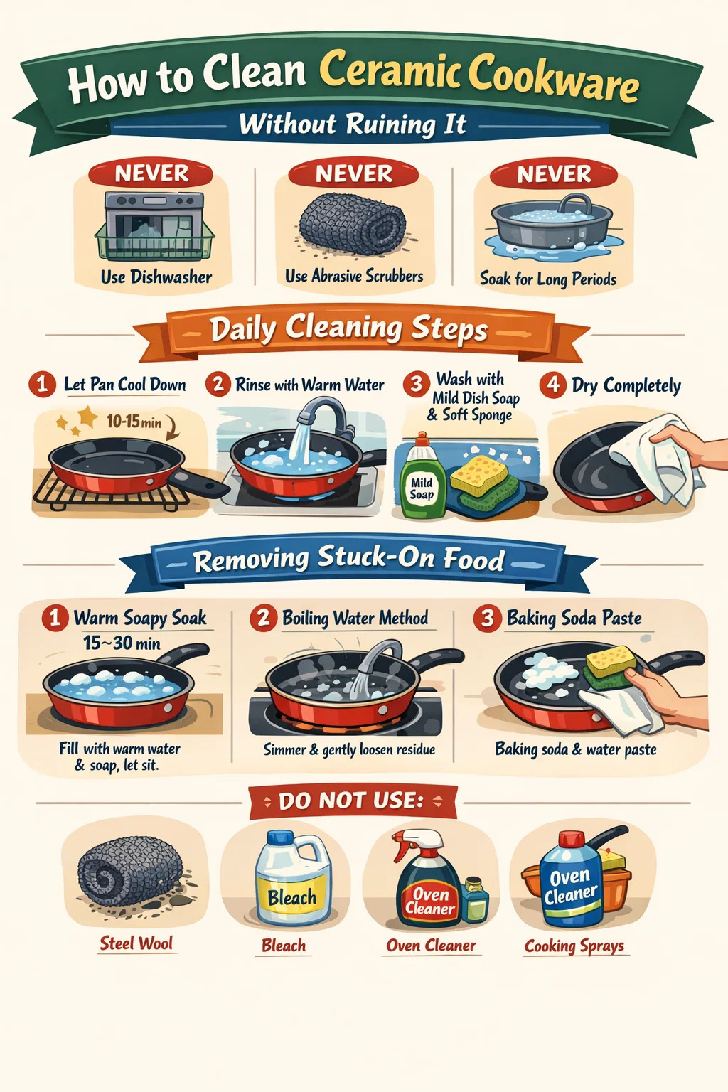 Keramikkochgeschirr sollte sofort nach dem Abkühlen mit warmem Wasser, ein paar Tropfen Spülmittel und einem weichen Schwamm oder Tuch gereinigt werden. Geben Sie es niemals in die Spülmaschine, verwenden Sie niemals scheuernde Scheuermittel und lassen Sie es niemals über einen längeren Zeitraum einweichen. Allein diese drei Regeln verlängern die Lebensdauer Ihres antihaftbeschichteten Keramikkochgeschirrs erheblich.