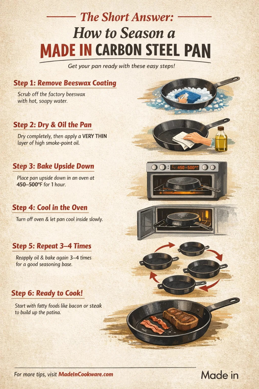 Um eine Pfanne aus Kohlenstoffstahl zu würzen, waschen Sie die schützende Bienenwachsbeschichtung ab, mit der sie geliefert wird, trocknen sie vollständig, tragen eine sehr dünne Schicht Öl mit hohem Rauchpunkt auf die gesamte Oberfläche auf und erhitzen sie in einem Ofen bei 450–500 °F, bis das Öl zu einer harten, glatten Schicht polymerisiert. Wiederholen Sie diesen Vorgang 3 bis 4 Mal vor deinem ersten Koch. Das ist der Kern davon. Alles andere – die spezifischen Öle, die Nuancen der Ofentemperatur, die Herdmethode, die Langzeitpflege – ist nur eine Verfeinerung dieses Grundgerüsts.